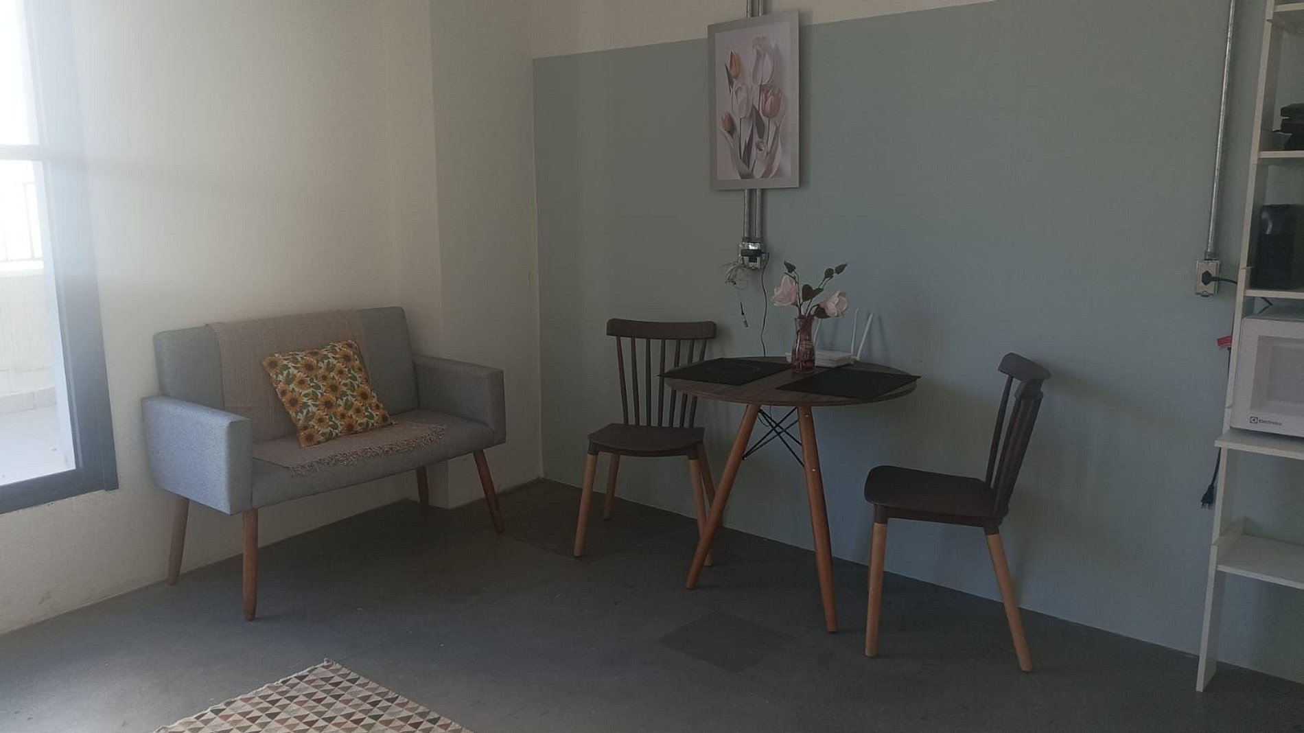 Nosso studio foi planejado para oferecer praticidade e conforto em um espaço compacto e bem decorado. A cama de casal garante noites de descanso, enquanto a cozinha equipada com utensílios básicos permite preparar refeições rápidas e funcionais.